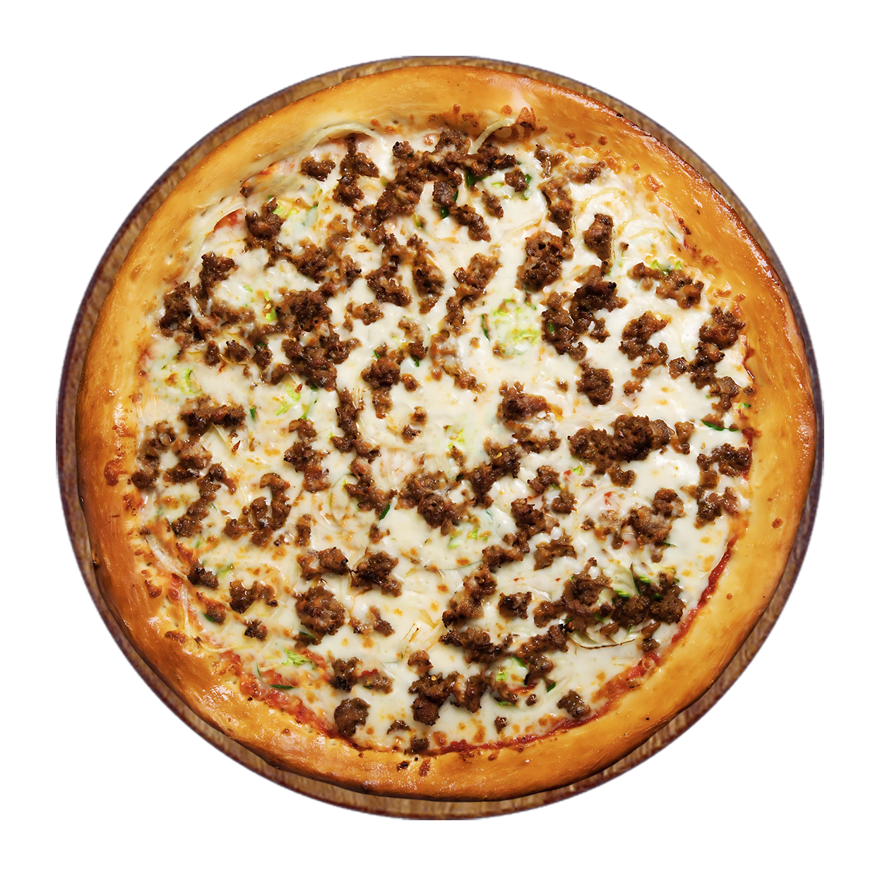 Crème fraîche, fromage, poulet, viande hachée, sauce cheddar, oignons frits.