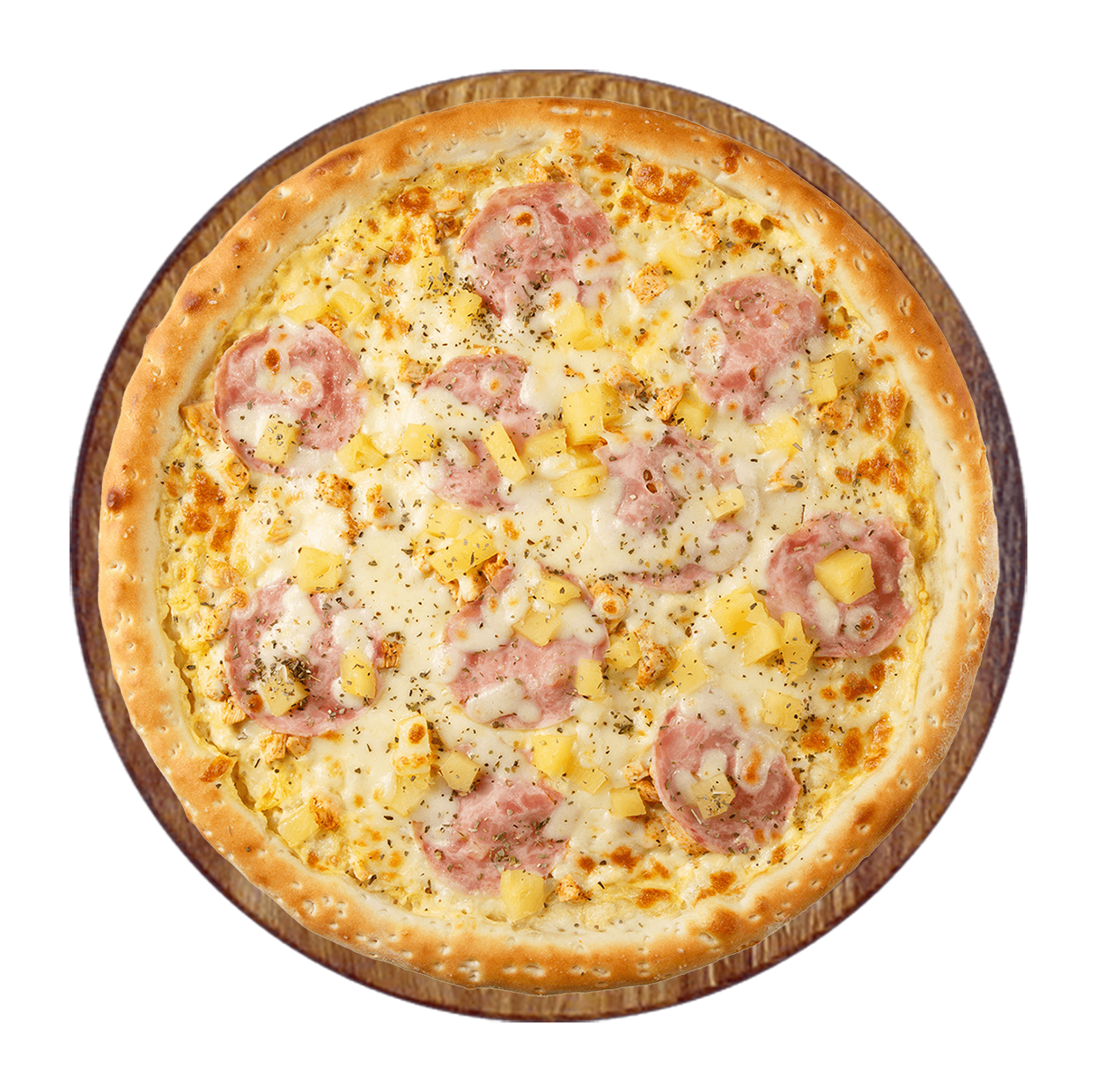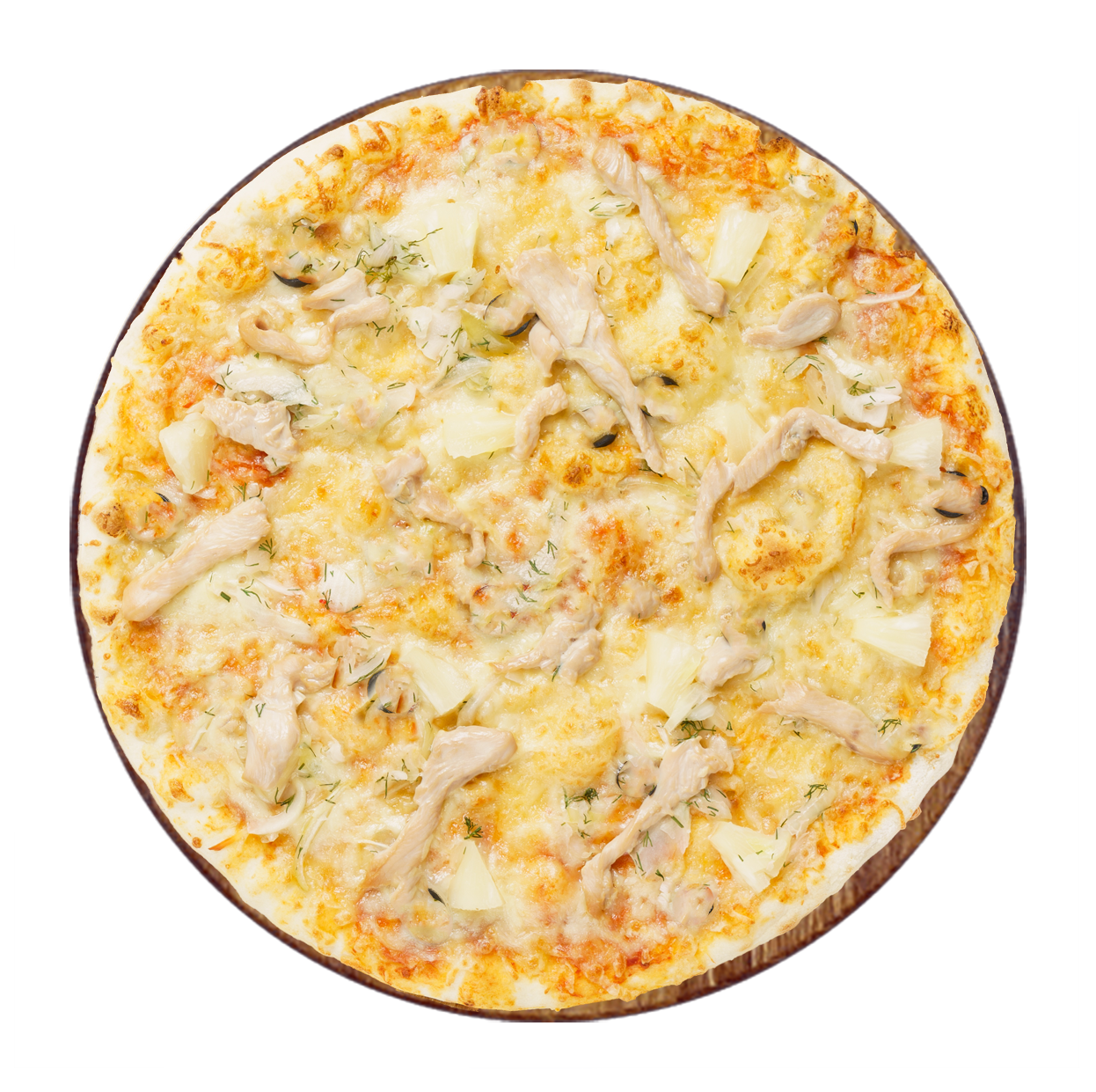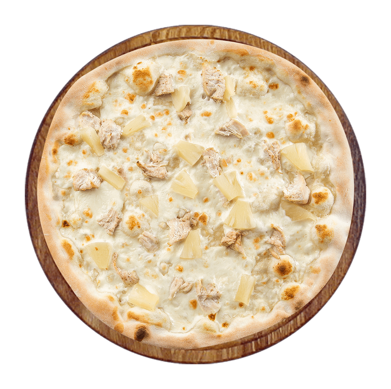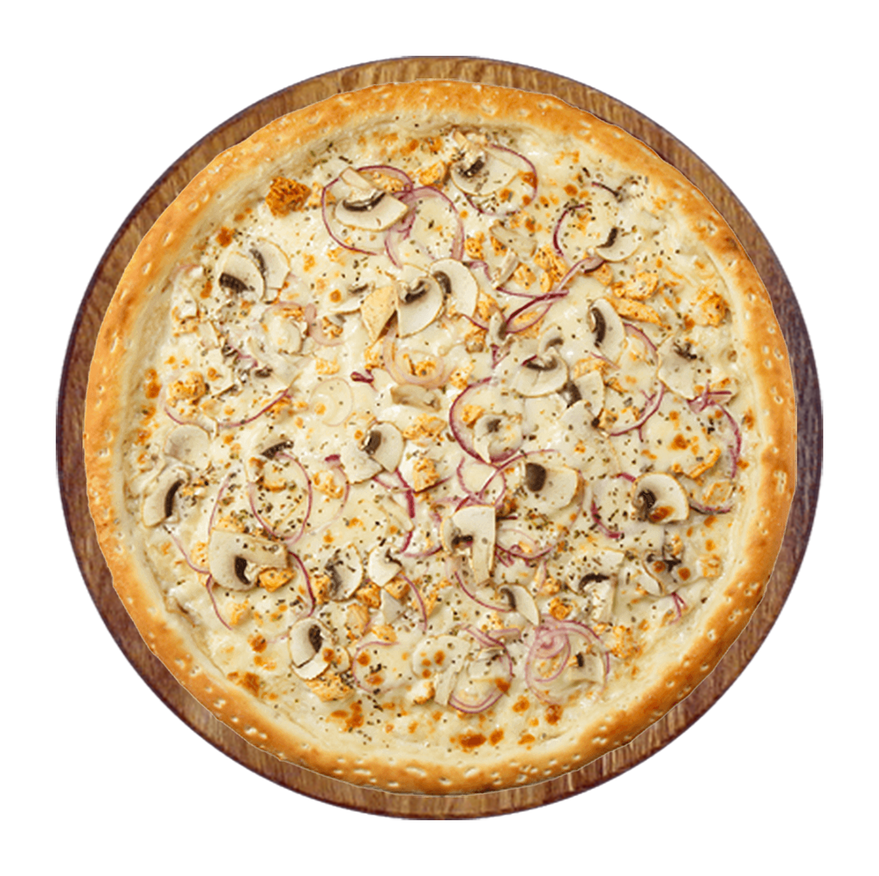 Crème fraîche, fromage, poulet, champignons, sauce gruyère.