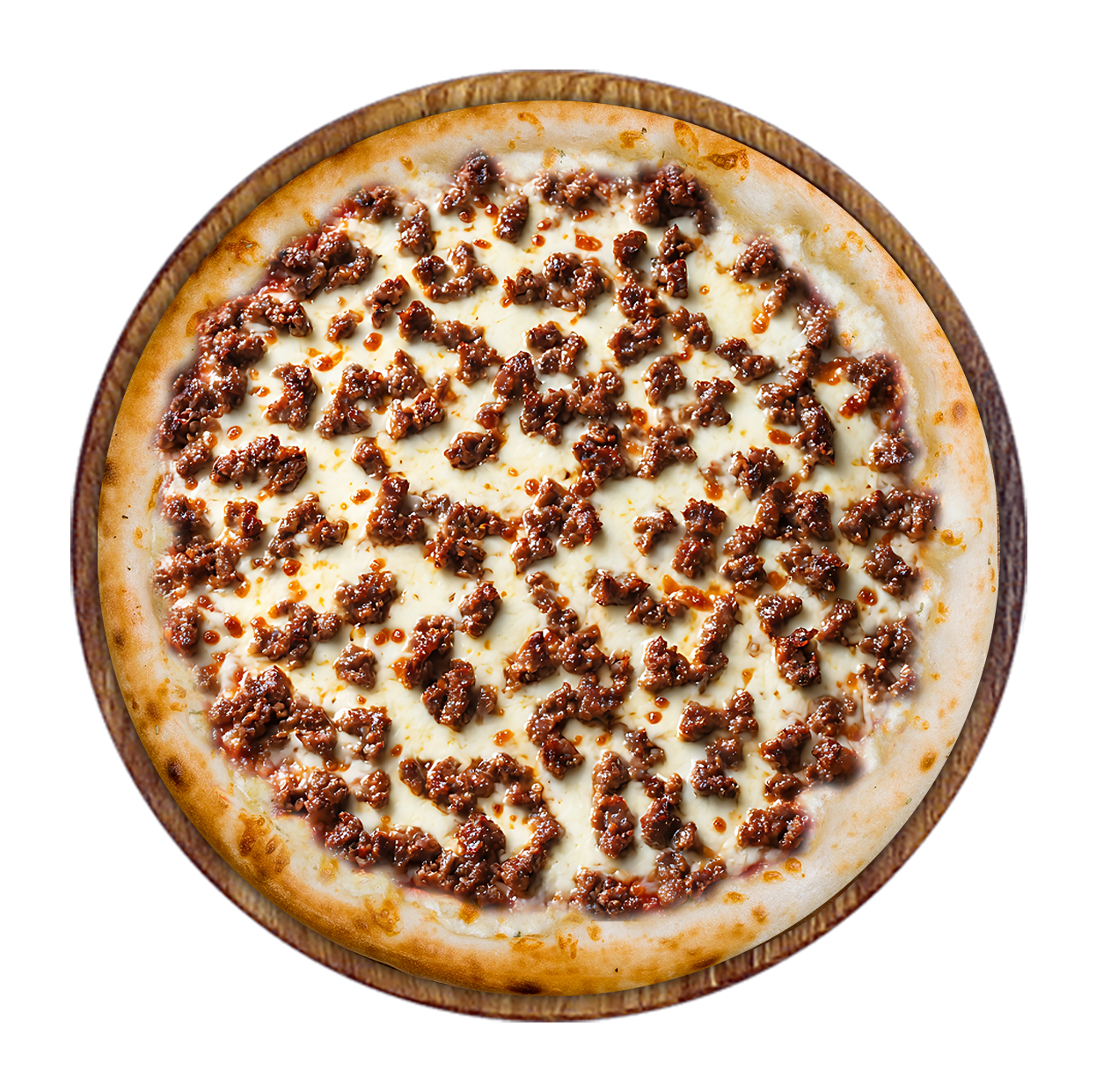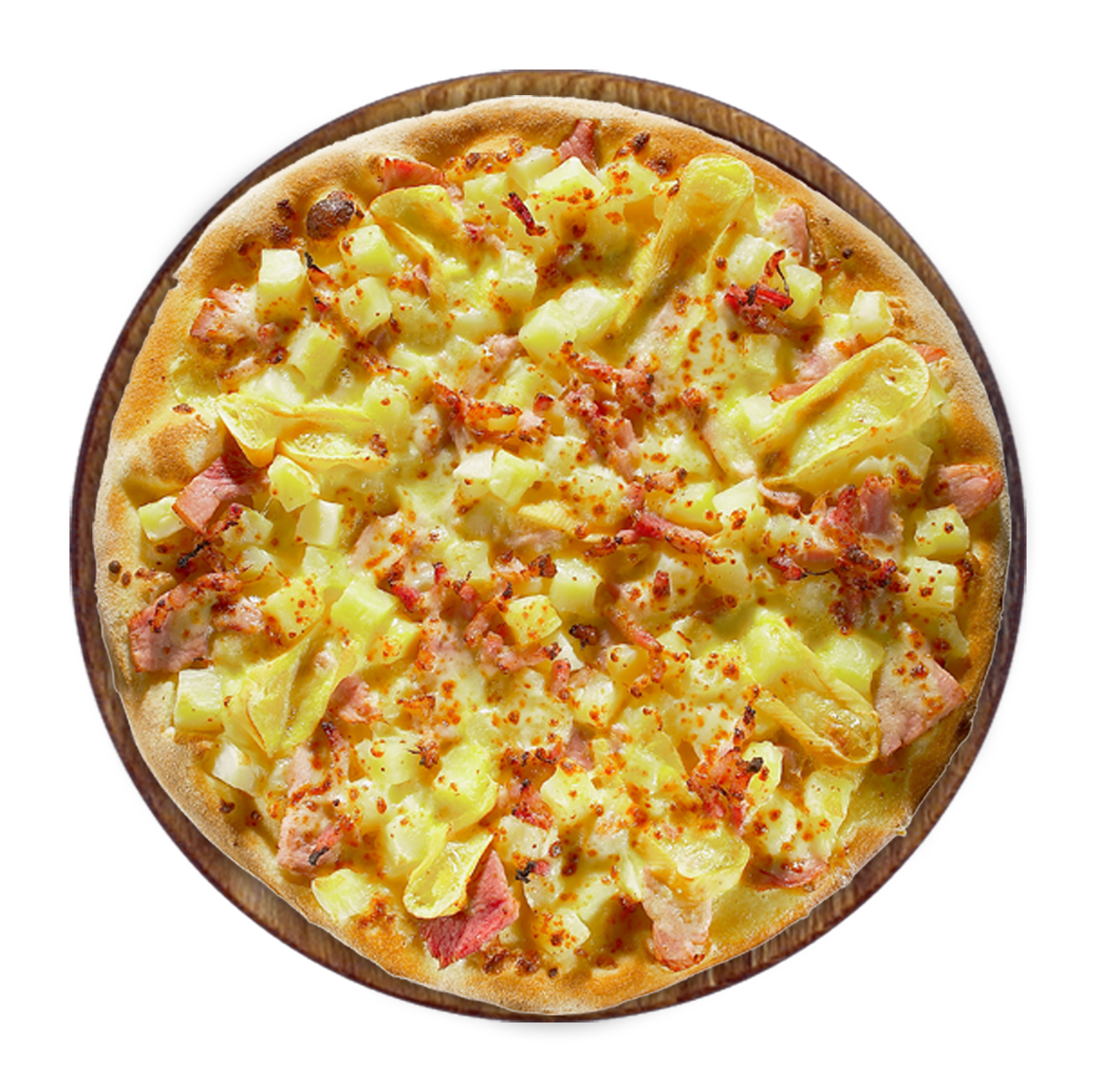 Crème fraîche, fromage, poulet, viande hachée, sauce cheddar, oignons frits.