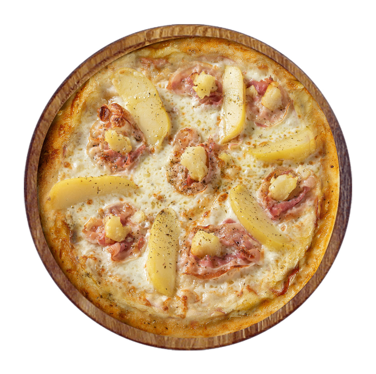 Crème fraîche, fromage, jambon, reblochon, pommes de terre, oignons.