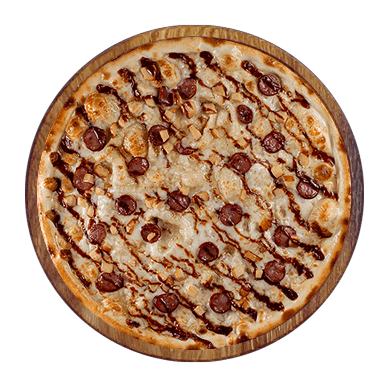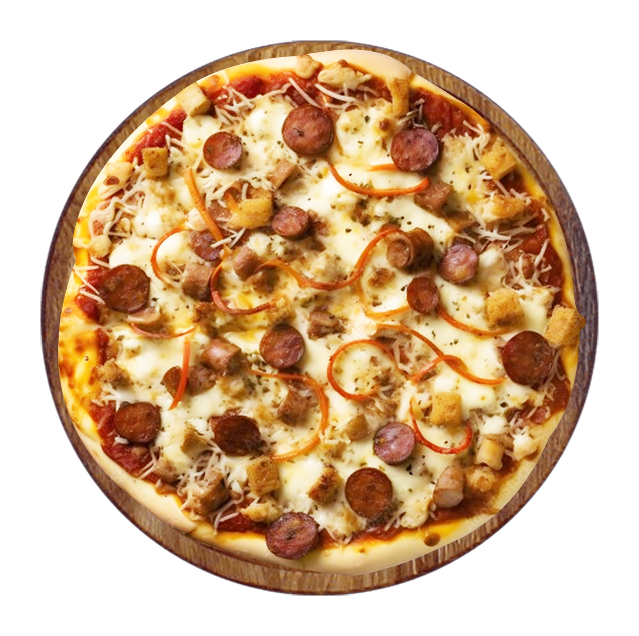 Sauce barbecue, viande hachée, merguez, chorizo, poivrons, oignons.